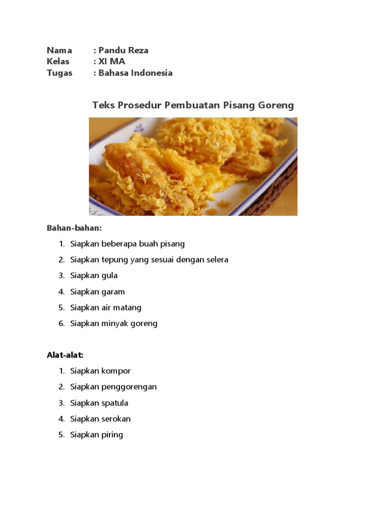 Pisang merupakan buah yang kaya vitamin C B6 dan kaya serat. Contoh teks prosedur kompleks hallo sahabatnesia pernah kalian membuat teks prosedur. Cara Membuat Pisang Goreng.