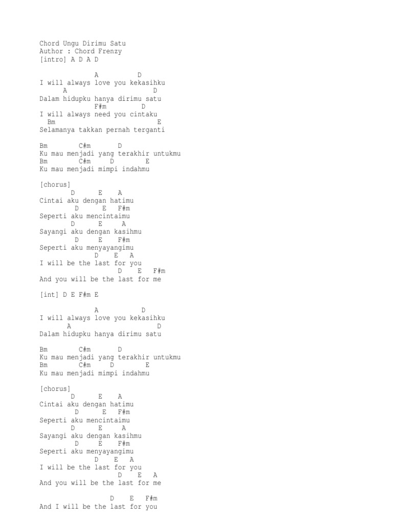 Chord Ungu Dirimu Satu - intro A D A D A D I will always love you kekasihku A D Dalam hidupku hanya dirimu satu Fm D I will always need you cintaku Bm E Selamanya takkan pernah terganti Bm Cm D Ku mau menjadi yang terakhir untukmu Bm Cm D E Ku mau menjadi mimpi indahmu chorus D E A Cintai aku dengan hatimu D E Fm Seperti aku mencintaimu D E A Sayangi. Intro A D A D. I will always love you kekasihku A D Dalam hidupku hanya dirimu satu Fm D I will always need you cintaku Bm E Selamanya takkan pernah terganti Bm Cm D Ku mau menjadi yang terakhir untukmu Bm Cm D E Ku mau menjadi mimpi indahmu chorus D E A.