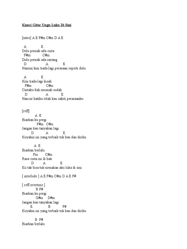 Kunci Gitar Chord Ungu - Luka Disini Capo di fret 2 Intro G D Em Bm C G D G D Dulu pernah ada cinta Em Bm Dulu pernah ada sayang C G D Namun kini tiada lagi perasaan seperti dulu G D Kini tiada lagi kisah Em Bm Cinta ku telah musnah sudah C G D Hancur hatiku telah kau sakiti perasaanku Chorus G D Biarkan ku pergi.