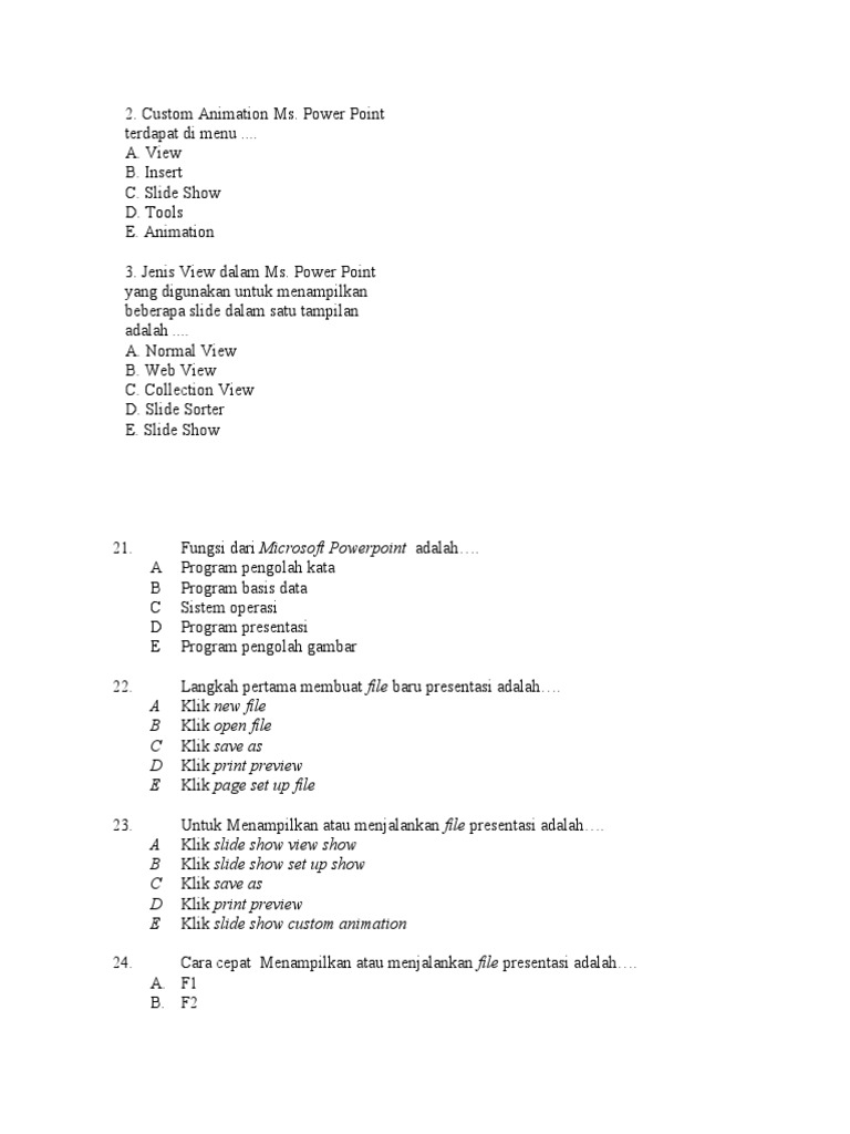 Nice good jawabnya nya. Powerpoint Pilihan Ganda dan Jawabannya Part-4 Bagi sahabat dimana saja berada yang ingin sekali mempelajari Soal Latihan adik adik bisa belajar materi ini di sini dalam bentuk latihan soal. Materi powerpointpoint biasanya didapatkan siswa SMP SMA dan SMKBerikut di bawah ini beberapa contoh soal powerperpoint.