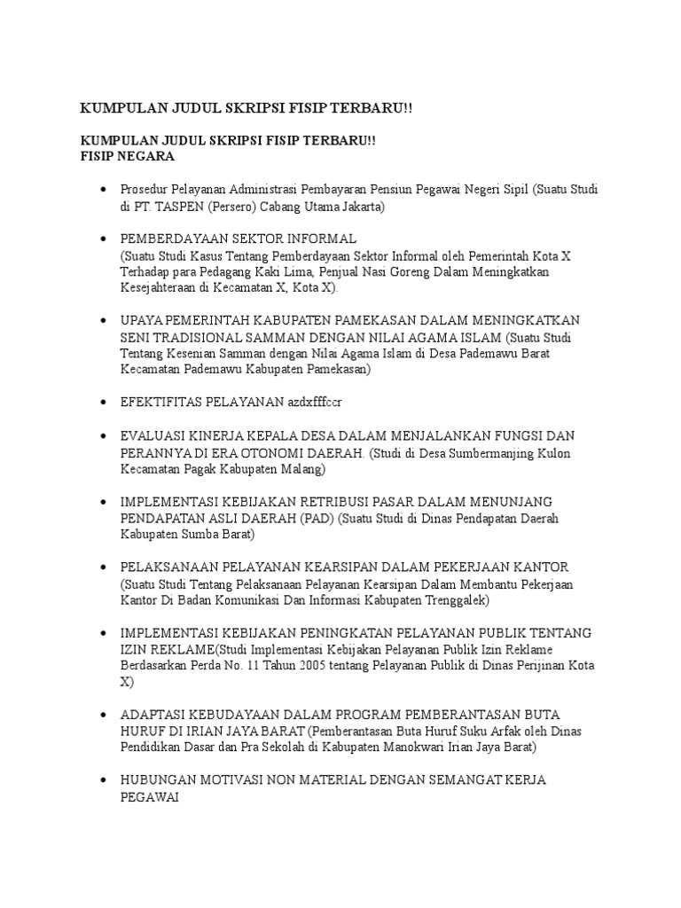 BUKU PEDOMAN PENYUSUNAN SKRIPSI TAHUN AKADEMIK 20172018 FAKULTAS ILMU SOSIAL DAN ILMU POLITIK UNIVERSITAS BRAWIJAYA Jl. KUMPULAN JUDUL SKRIPSI FISIP TERBARU. TASPEN Persero Cabang Utama Jakarta PEMBERDAYAAN SEKTOR INFORMAL.